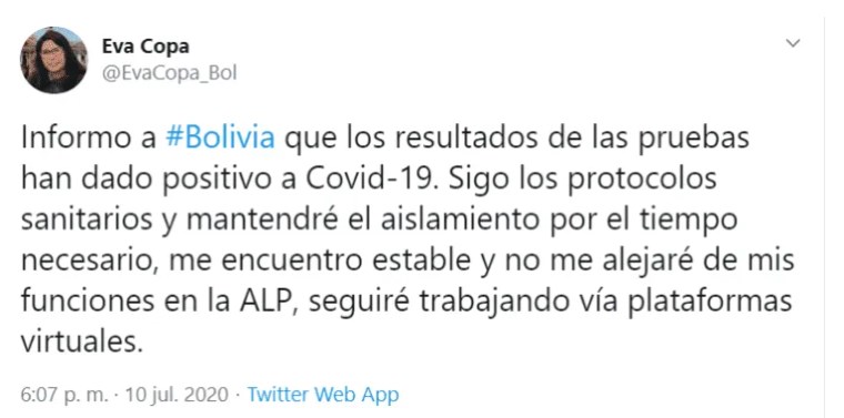 "Informo a Bolivia que los resultados de las pruebas han dado positivo a Covid-19. Sigo los protocolos sanitarios y mantendré el aislamiento por el tiempo necesario, me encuentro estable y no me alejaré de mis funciones en la Asamblea Legislativa Plurinacional, seguiré trabajando vía plataformas virtuales", anunció Copa a través de su Twitter.