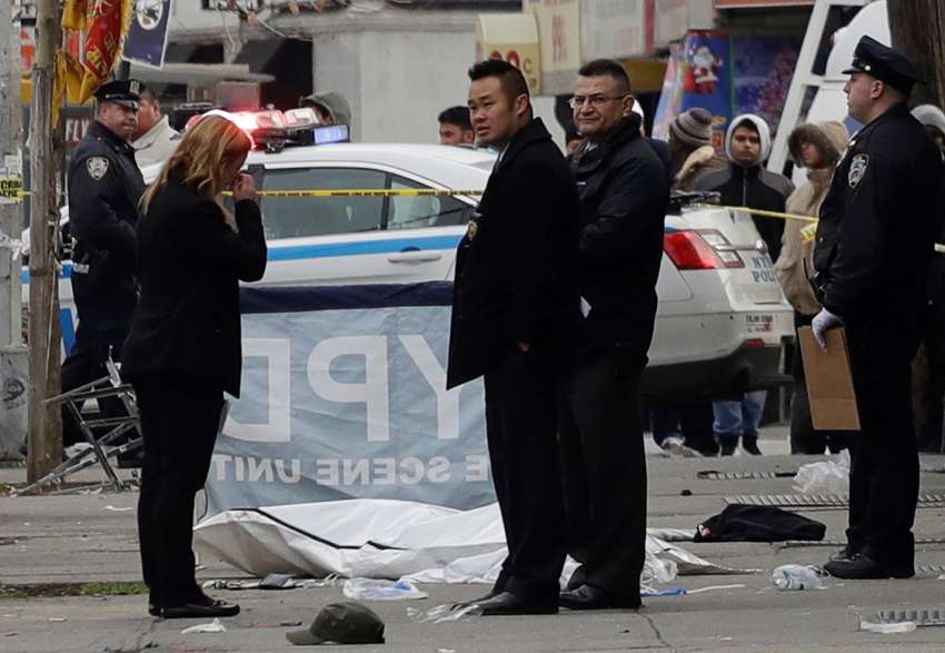 Un hombre apuñaló a dos personas y luego embistió a un grupo de transeúntes que estaba en una acera de la ciudad de Nueva York, dejando a una persona muerta y a otras heridas, una de ellas en condición grave.