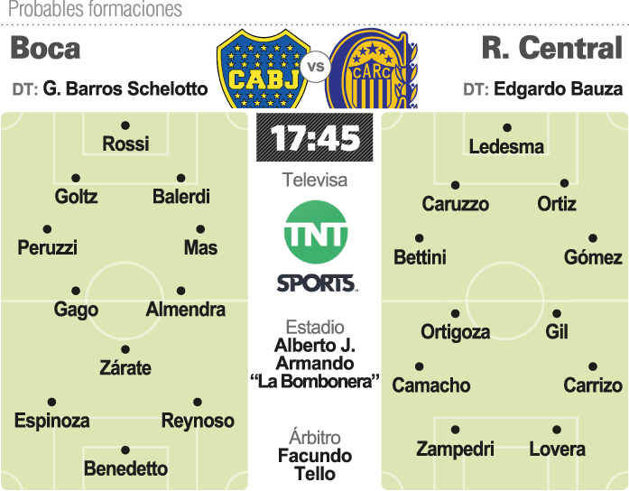Boca recibirá a Rosario Central, con la mente puesta en el duelo ante Palmeiras por la Copa Libertadores. Por este motivo, Guillermo Barros Schelotto guardará a la mayoría de sus titulares, pero no todos ya que Goltz, Gago, Zárate y Benedetto serían de la partida ante los rosarinos. Tras un nuevo ensayo en el Complejo Pedro Pompilio, el "Mellizo" paró el siguiente equipo: Agustín Rossi; Gino Peruzzi, Paolo Goltz, Leonardo Balerdi, Emmanuel Mas; Fernando Gago, Agustín Almendra; Cristian Espinoza, Mauro Zárate, Emanuel Reynoso; y Darío Benedetto.