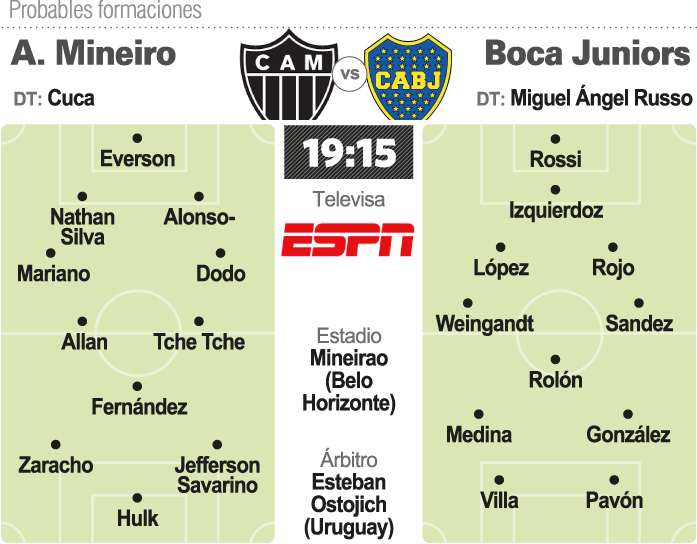 Para buscar la clasificación en el histórico "Mineirao", Russo apostaría por el mismo equipo que jugó en la ida en la Bombonera pero también podría optar por una variante en la defensa: podría ingresar Lisandro López en una línea de tres defensores centrales, y en ese caso saldría el delantero Norberto Briasco. El cuerpo técnico preservó a la mayoría de los titulares para la revancha y en el debut en el torneo de la Liga Profesional utilizó una formación alternativa que a diez minutos del final dejó escapar el triunfo en Santa Fe. Este partido también será un examen para la dirigencia liderada por Juan Román Riquelme que invirtió en los pases de Norberto Briasco, Esteban Rolón y Nicolás Orsini y todavía no se retiró del mercado de pases para renovar un plantel que tuvo las salidas de Carlos Tevez, Esteban Andrada, Nicolás Capaldo, Mauro Zárate, Franco Soldano, Emmanuel Mas, Leonardo Jara y Julio Buffarini.