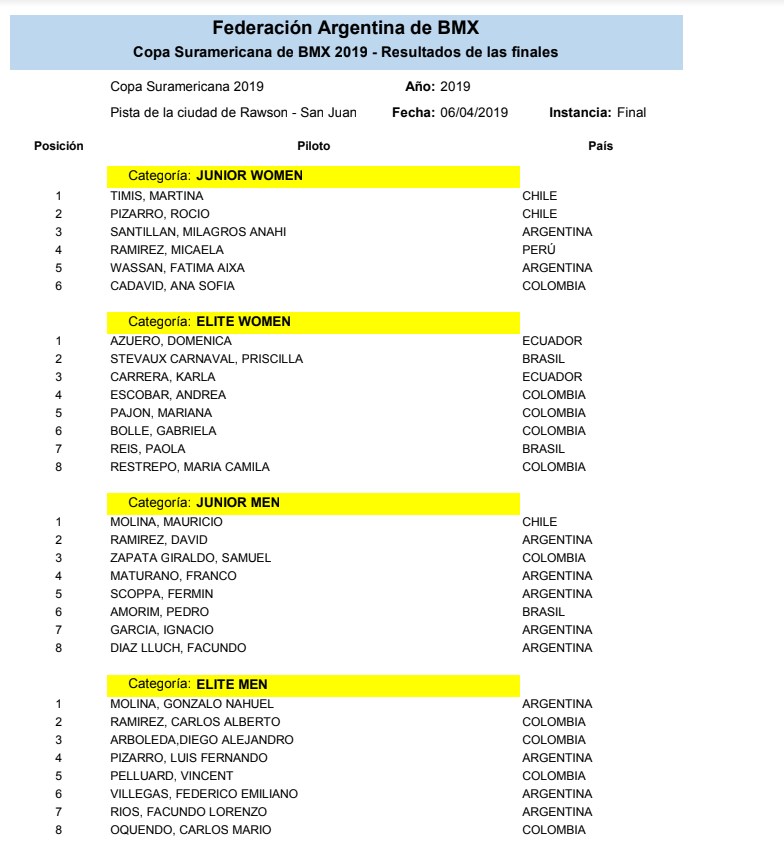 A continuación, los resultados de las distintas categorías: