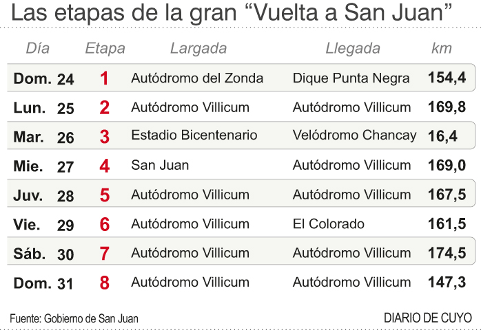 La competencia comenzará el próximo domingo 24 de enero. La primer etapa partirá del autódromo El Zonda-Copello’ y concluirá en el Dique Punta Negra, recorriendo 154,4 kms. La última, el domingo 31. Para ir agendando, la contrarreloj individual será el martes 26 y la etapa reina (volviendo a llegar a El Colorado), el viernes 29. Por supuesto, en esta edición se anula la jornada de descanso. Además, en 5 ocasiones el autódromo El Villicum ser{a punto de salida o llegada.