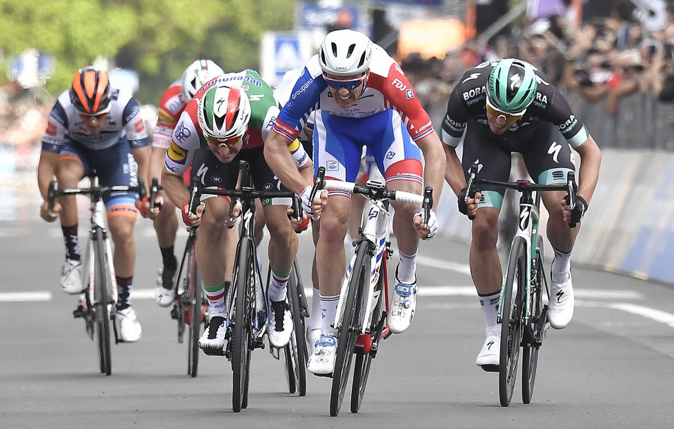 El velocista francés Arnaud Démare (Groupama-FDJ), ganador de Milano-Sanremo en 2016, logró ayer su primera victoria de etapa en el Giro de Italia en una final en el que no participó quien lleva la malla líder de la regularidad, el alemán, Pascal Ackermann (Bora-Hansgrohe) víctima de una caída faltando un kilómetro y medio para la meta. Elia Viviani (Deceuninck-Quick Step) y Rüdiger Selig (Bora-Hansgrohe), segundo y tercero en la línea de meta en Módena, completaron el podio del día.