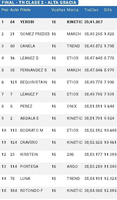 El sanjuanino Diego Leánez (Toyota Etios), Sergio Fernández (Nissan March), Nazareno Beguiristain (Toyota Etios), el otro representante de San Juan al TN, Facundo Leánez (Toyota Etios), Sebastián Pérez (Chevrolet Onix), Emanuel Abdala (Fiesta Kinetic) y Christian Bodrato Mionetto (Toyota Etios), completaron las principales posiciones.