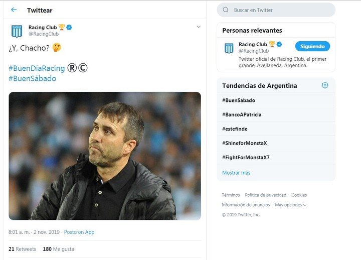Racing arrancó este sábado con un enigmático posteo en sus redes sociales. Mientras el futuro de Eduardo Coudet en la conducción técnica de la Academia está más que en duda para el 2020, debido al irregular presente del equipo y a las ofertas que tiene sobre la mesa el DT, el club tuiteó una foto del técnico con una frase extraña. "¿Y, Chacho?", decía la publicación, casi como preguntándole al entrenador que será de él después de diciembre. Luego, el posteo misteriosamente fue eliminado.