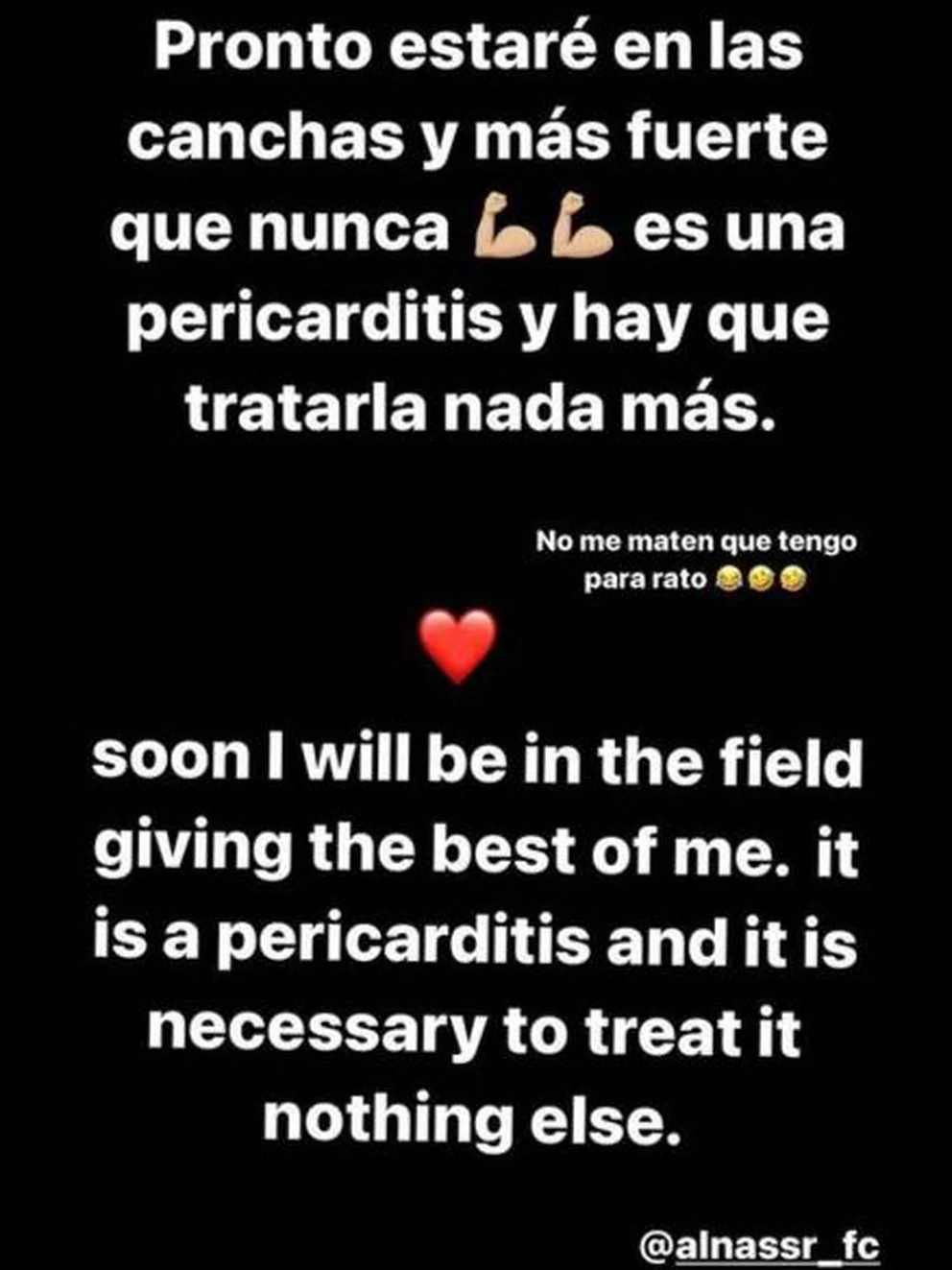 “Pronto estaré en las canchas y más fuerte que nunca. Es una pericarditis y hay que tratarla nada más”, publicó la figura surgida del Globo de Parque Patricios a través de su cuenta oficial de Instagram. El mendocino se expresó mediante sus redes sociales ya que el departamento de prensa de Arabia Saudita había informado que por este inconveniente cardíaco, el club estaba analizando la rescisión del contrato y también puso en duda la continuidad de su carrera. “No me maten que tengo para rato”, agregó el Pity Martínez en el mismo texto publicado en una historia de sus redes.