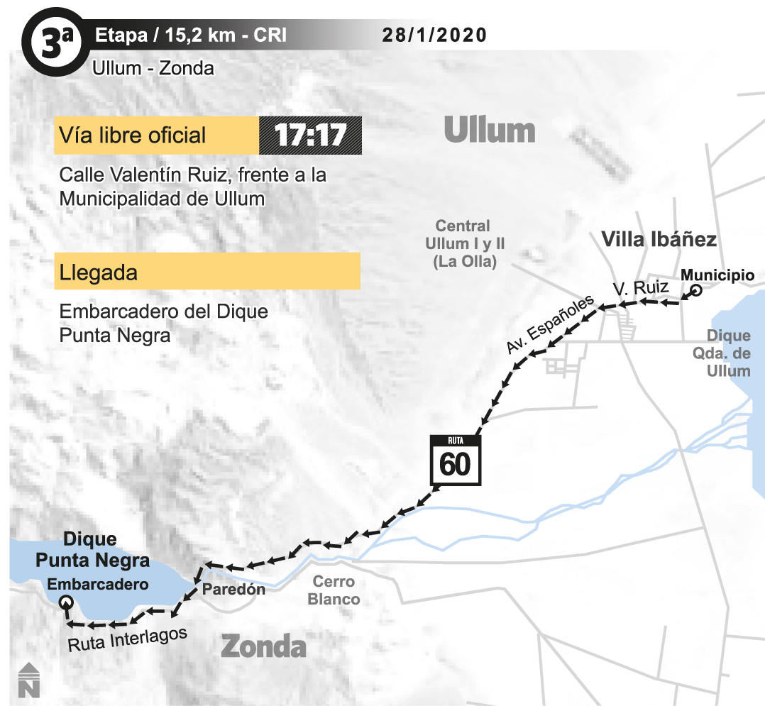 La contrarreloj de hoy, que se desarrollará por primera vez en la Ruta 60, desde la Municipalidad de Ullum hasta el embarcadero del Dique Punta Negra contará con un aditamento que la convierte en especial. Un tramo de la misma es en ascenso: los caracoles que llevan hasta el Paredón del Dique. Son 15,2 kilómetros planos en sus primeros 11.000 metros, pero con un desnivel de 167 metros en el segmento de 1,4 kilómetros del técnico "curverío" que pondrá a prueba la fortaleza física de los pedalistas.