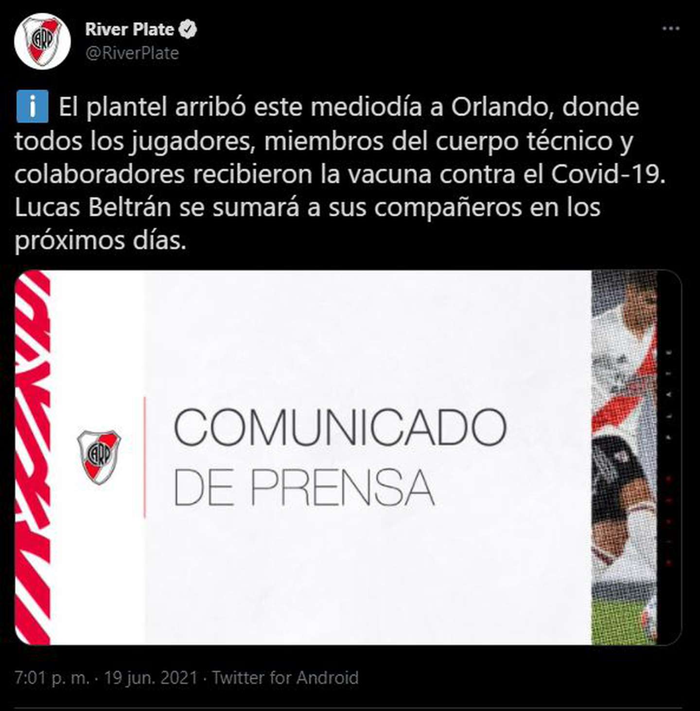 La delegación del Millonario fue inoculada en el mismo aeropuerto de Orlando y por la tarde tenía programada la primera práctica en el ESPN Wide World of Sports Complex, donde se jugaron los playoffs de la temporada pasada de la NBA y de la MLS de fútbol en 2020.