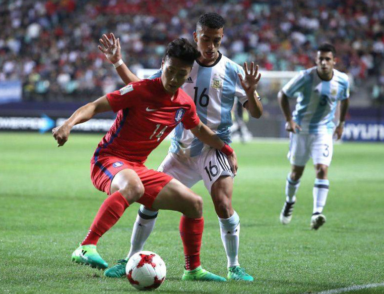 El seleccionado argentino Sub 20 sumó ayer su segunda derrota en el Mundial de Corea, esta vez ante el local por 2-1 en Jeonju, y su clasificación a la siguiente ronda depende de una victoria por goleada sobre Guinea el viernes y que se dé una combinación de resultados ajenos. Corea se despachó con dos goles en el primer tiempo a través de su estrella Seung woo Lee a los 18‘ y Seung ho Paik, de tiro penal, a los 43.