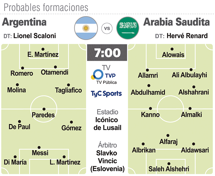 A partir de las 7 horas, en el majestuoso Lusail, por el Grupo C de este primer Mundial en Medio Oriente, la albiceleste buscará dar ese primer paso tan necesario de manera correcta. Como todo debut mundialista, implica una carga emocional más que intensa: "Contra Arabia nos espera un partido difícil. Me siento con muchas ganas, ilusionado. Intentaremos hacer el mejor partido para arrancar con los tres puntos", afirmó el capitán nacional durante la charla con la prensa, que contó con la presencia de más de 500 periodistas de todo el mundo.