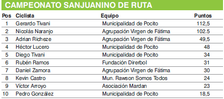 A la definición llegaron empatados, con seis puntos, Tivani y Naranjo, quienes no puntuaron en el último embalaje pero en la disputa entre ellos, el rivadaviense apeló a su golpe de pedal para quebrar al sureño en los últimos cinco metros, por lo que esta tarde, Nicolás Naranjo será quien lleve sobre su pecho la malla de cuadros azules.