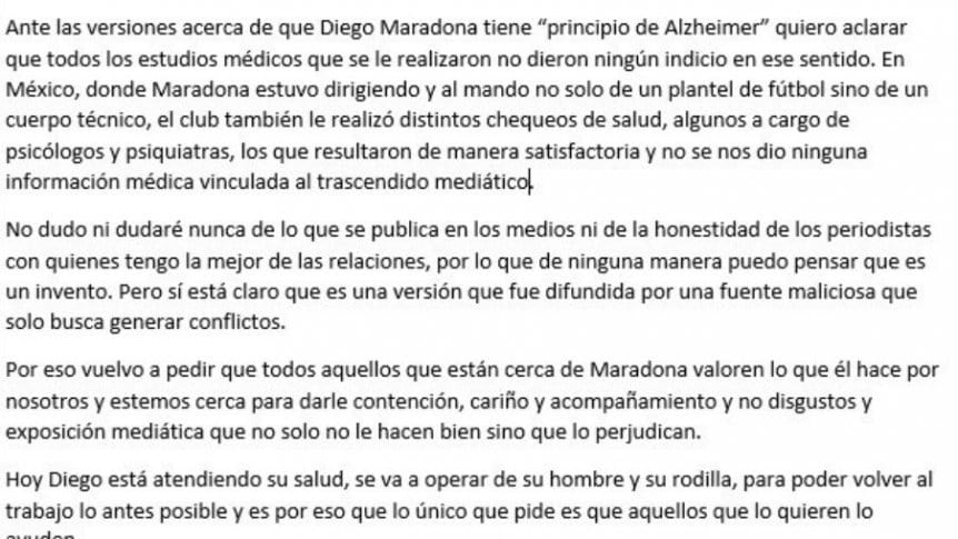Luego de algunos trascendidos mediáticos sobre la salud de Diego Armando Maradona, que en los últimos días dejó su cargo en Dorados de Sinaloa debido a dos operaciones que tenía que realizarse (hombro y rodilla) en el corto plazo, Matías Morla, el abogado que trabaja junto a Diego, emitió un comunicado donde negó el supuesto principio de Alzheimer.