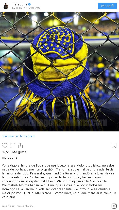 "Uno, que se cree que por ir todos los domingos a la cancha, puede ser vicepresidente. Y el otro, que se vendió al mejor postor. Un club TAN GRANDE como Boca, no puede manejarse como un vestuario", cerró Maradona.