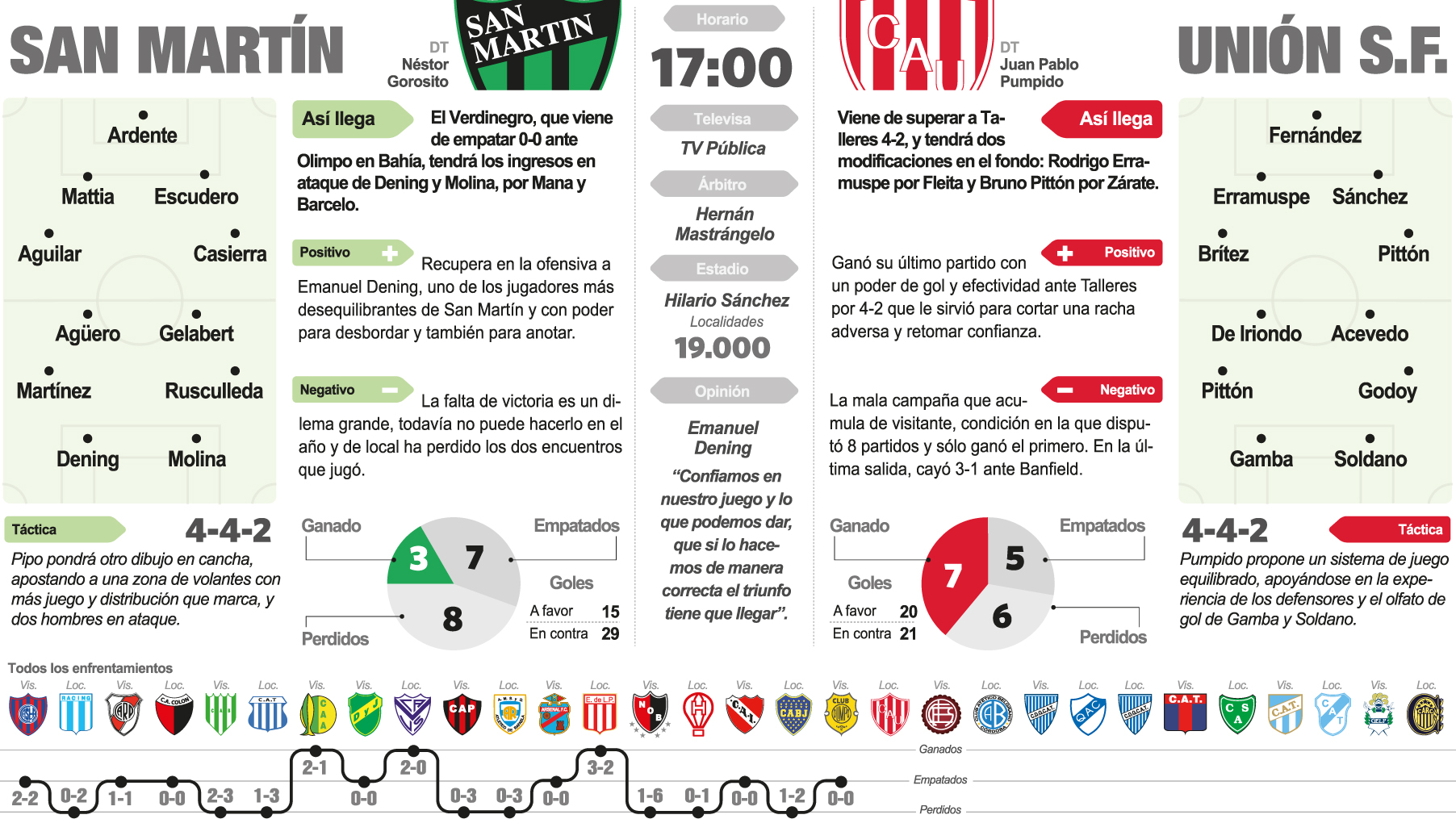 Por el lado de Unión, que de visitante ganó su último partido el 17 de septiembre del año pasado (1-0 a Lanús), pero que viene de un enorme triunfo sobre Talleres a puro gol (4-2), buscará darle continuidad a efectividad ante un San Martín que está complicado y que hoy tiene prohibido perder.