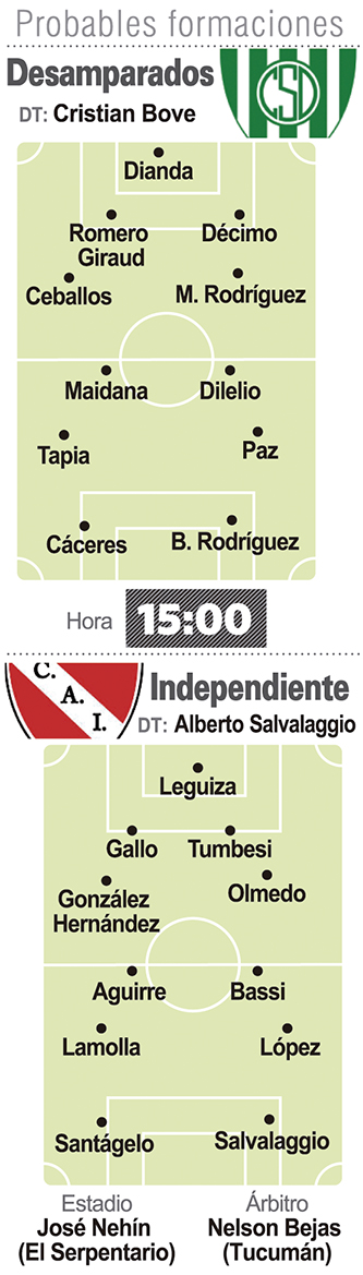 En lo futbolístico, Bove cambia lo justo y necesario. El rendimiento ante Estudiantes lo dejó conforme. Tras la expulsión de Pablo Jofré, era Lucas Salas quien se encaminaba a reemplazar al "Peca" pero el ex San Martín sufrió un desgarro el miércoles y será Lucas Dilelio quien irá de arranque. Lo demás no se toca. Enfrente tendrá a un equipo que viene de ganarle Villa Mitre y que busca seguir ubicado en zona de clasificación.