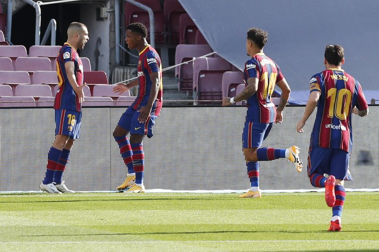 Más allá del golpe, el Barcelona salió rápido a buscar el empate y lo consiguió sólo cuatro minutos más tarde. A los 8′, gran pase de Messi para Jordi Alba, que se escapó hasta la línea de fondo y tiró el centro para que Ansu Fati, en posición de número 9, defina a la red.