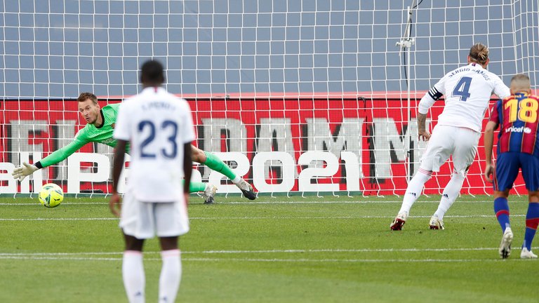 A pesar de que los locales estaban dominando el juego, el Real Madrid se puso en ventaja a los 18′ del complemento. El francés Lenglet tomó de la camiseta a Sergio Ramos dentro del área y, después de la revisión del VAR, el juez marcó la falta que el histórico central de los merengues cambió por gol.