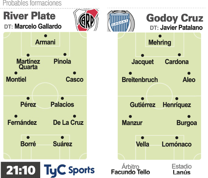Hoy en Lanús, River jugaría con la misma formación que goleó a Huracán 4-0 en Parque de los Patricios según lo que dejó vislumbrar Gallardo. El rival de este equipo "Millonario" es Godoy Cruz, conjunto mendocino que atraviesa una crisis de resultados y presenta su peor inicio de temporada desde que está en primera con un 17% de eficacia. El "Tomba" está anteúltimo con apenas tres unidades, producto de un triunfo (cuarta fecha de Superliga ante Estudiantes) y cinco derrotas, superando apenas a Gimnasia y Esgrima la Plata que tiene como estelar entrenador a Diego Maradona.