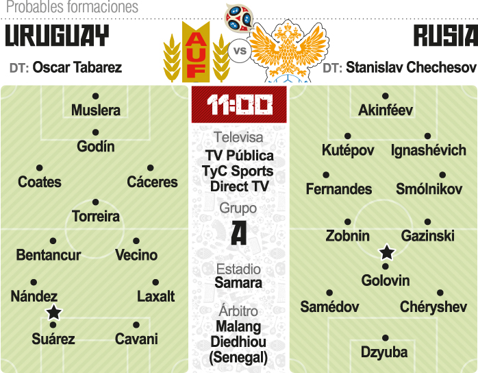 El anfitrión Rusia y Uruguay, ambos clasificados a los octavos de final, se enfrentarán hoy en la ciudad de Samara para definir el primer puesto del Grupo A, que será el primero en clausurarse en el Mundial 2018.