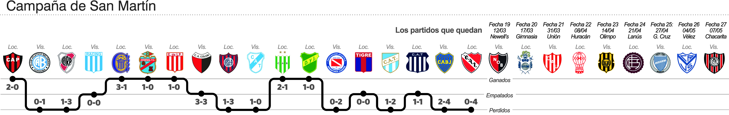 Tener una luz de 16 puntos sobre 27 posibles sobre el último de los que hoy están perdiendo la categoría se convierte en el plazo fijo de las inversiones de San Martín de cara al final de la Superliga. Y es que la goleada en contra ante Independiente, como local, no sólo sirvió para estirar la serie sin triunfos en este 2018 sino que además encendió luces de alarma de cara al futuro mediato. En este certamen, la permanencia es un hecho. Después… habrá que ver cuánto cosecha en las 9 fechas que restan, sabiendo que serán 4 partidos como local y 5 afuera. Con el plus de que tendrá cruces directos con los más amenazados y casi condenados como Huracán y Vélez a los que recibirá en Concepción, mientras que irá a Olimpo de Bahía Blanca y Chacarita Juniors.