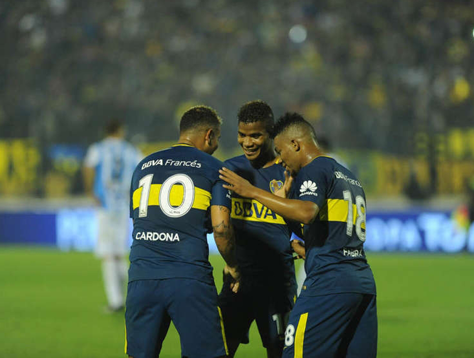 Alegría cafetera. Los colombianos Edwin Cardona (10), Frank Fabra y Wilmar Barrios celebran uno de los cinco goles de Boca ante los salteños. El actual campeón doméstico tuvo una gran labor en Formosa.