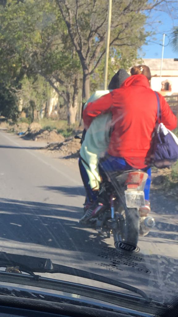 Un lector envió una imagen y el siguiente cometario: "Esto es en Calle 10 pasando Mendoza. Van un papá, una mamá, un bebé y los adultos sin casco….un peligro".