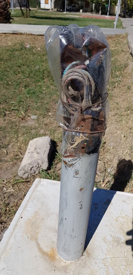 Un lector envió la imagen de una precaria reparación realizada en una columna con electricidad ubicada en la plaza del barrio Ceramista, en Rawson.