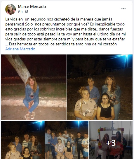 En las últimas horas, las redes sociales se colmaron de mensajes de despedida. El más doloroso quizás fue el de su hermana Marcela. "La vida en un segundo nos cacheteó de la manera que jamás pensamos! Solo nos preguntamos por qué vos? Es inexplicable todo esto, gracias por los sobrinos increíbles que me diste… danos fuerzas para salir de esta pesadilla. Te voy amar hasta el último día de mi vida, gracias por estar siempre para mí y para bauty que te va extrañar. Eras hermosa en todos los sentidos, te amo hermana de mi corazón", escribió.
