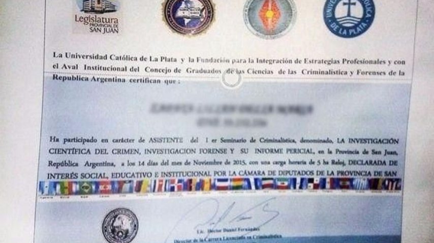 Darío Murúa y Héctor Daniel Hernández están acusados de liderar una banda que dictó cursos, seminarios y hasta una diplomatura de los que entregaban títulos supuestamente avalados por la Universidad Católica de La Plata que resultaron ser apócrifos. Fernández es director de la carrera de Licenciatura en Criminalística de la Casa de Estudios platense. Los dos dictaban las clases y también habían contratado como docentes a prestigiosos profesionales. Para completar el ardid, a través de vínculos políticos, lograron que tanto la Legislatura de San Juan como la Unicameral de Córdoba declararan las "carreras" de interés social, educativo e institucional. No sólo eso, en los falsos títulos aparece un sello y la firma de un supuesto funcionario del Ministerio del Interior dándole validez a la firma del rector de la UCALP.