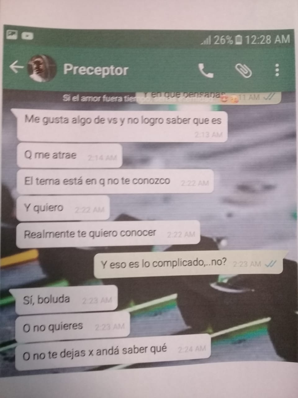 Pero no sería la única propuesta sexual. Habría una anterior con el mismo tono pero que esa conversación se borró. "Si pueden reconstruir esas charlas, aparecerá", apuntó plaza. El abogado reconoce, por dichos de la menor a su mamá y a su padrastro (fue quien golpeó alñ preceptor), que la chica tuvo una especie de "enamoramiento" que la llevó a caer en manos del hombre.
