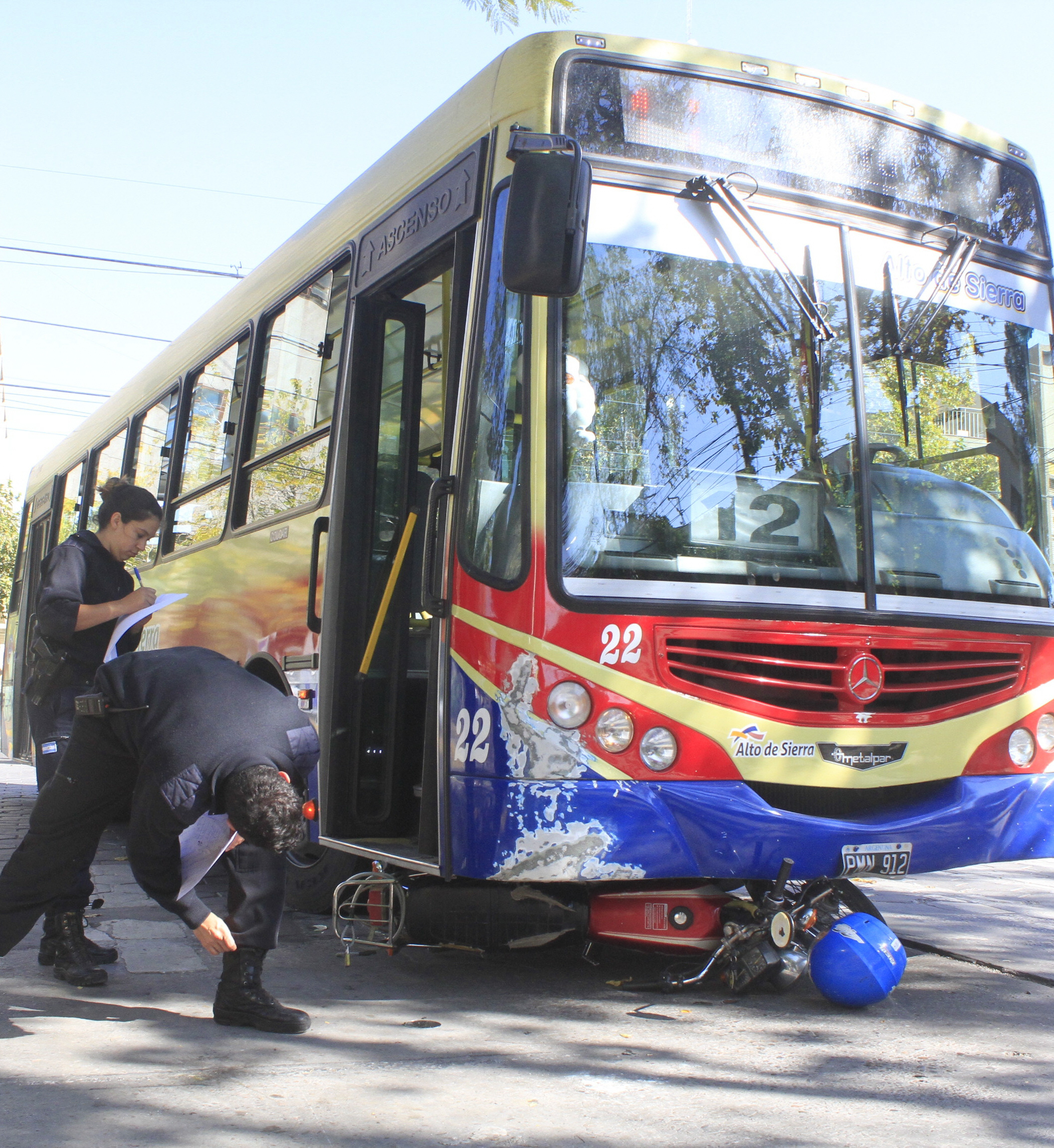 Pacheco terminó con moto y todo bajo el colectivo en el cruce de Ignacio de la Roza y avenida Rioja, sobre las 11,30 de ayer.