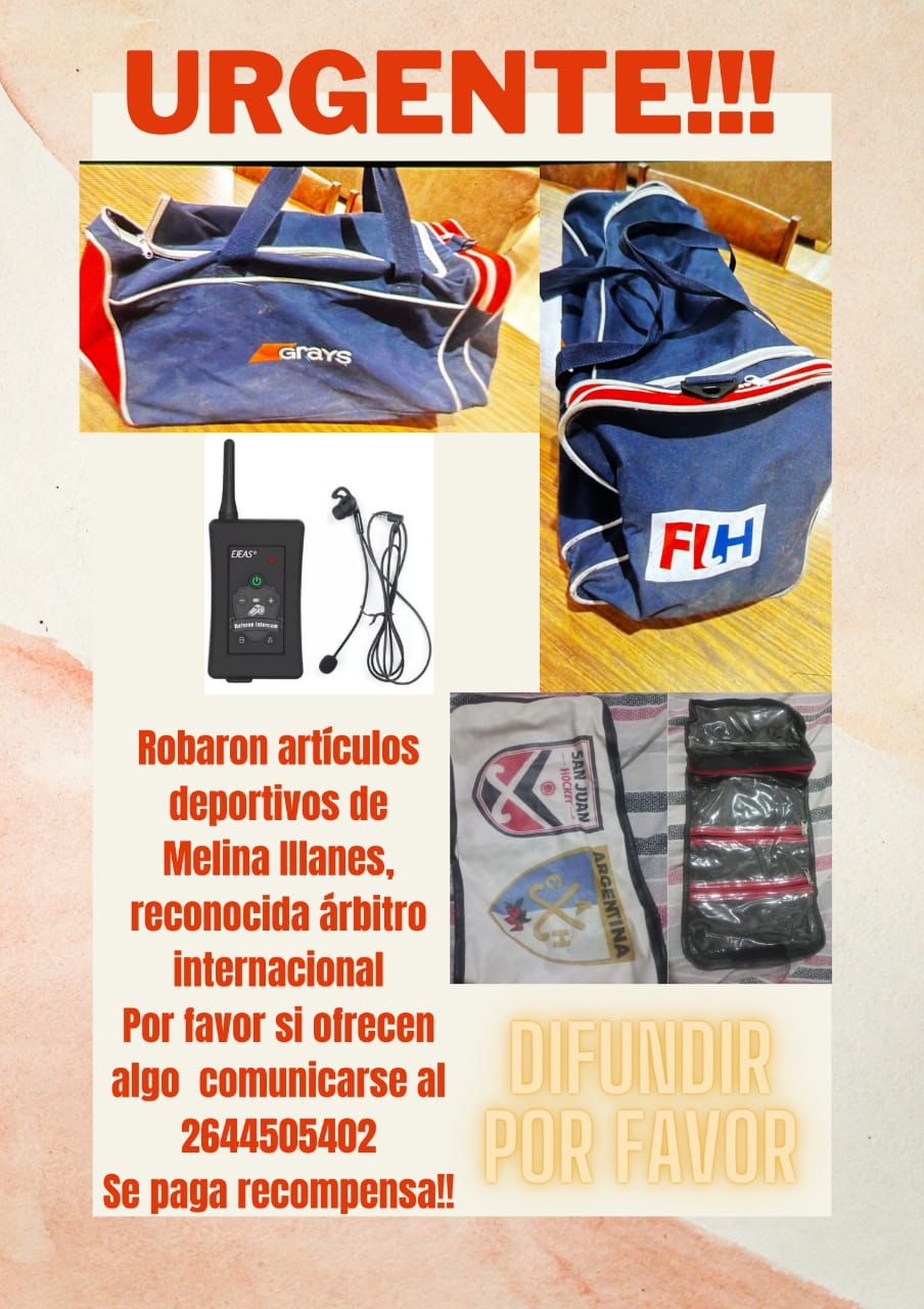 Melina Illanes (40) es una sanjuanina, conocida en el ambiente de Hockey sobre Césped y Pista no sólo por haber sido jugadora sino que desde el 2007 es árbitro de la disciplina y en el 2014 obtuvo su título internacional. Pero en la ocasión no es noticia por sus participaciones en el deporte sino que durante la siesta de este miércoles, delincuentes irrumpieron en su casa y se llevaron todo lo que pudieron. Aunque lo que más le duele es un bolso de arbitraje que no solo es único en la provincia sino que tiene una importante carga afectiva para ella y por el que ofrece recompensa.