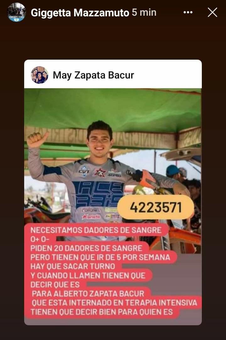 Ahora, desde su entorno solicitaron con urgencia a la comunidad 20 dadores de sangre 0+, 0-. Según se informó, pueden ir sólo 5 personas por semana por lo que es necesario pedir turno al 4223571.