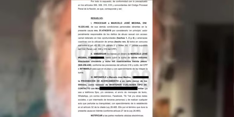 De acuerdo al fallo judicial, Teto Medina fue procesado tras ser considerado “autor penalmente responsable de los delitos de abuso sexual con acceso carnal reiterado en tres oportunidades (hechos 1, 2 y 4) y amenazas coactivas con la utilización de arma” y, además, se estipula que se embarguen los bienes y dinero del hombre hasta “cubrir la suma de $20.258.430″.