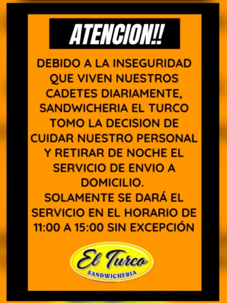 Martín Abraham tiene 19 años y el lunes pasado por la noche vivió el peor momento desde que trabaja como repartidor para una de la dos sucursales de la reconocida sandwichería El Turco de la ciudad de San Miguel de Tucumán: mientras entregaba un pedido, a unas 30 cuadras del local, fue abordado por un delincuente que, sin mediar palabra, lo atacó con un machete para asaltarlo y le cortó cuatro dedos de su mano izquierda. Si bien la víctima está fuera de peligro, Sergio Santillán, propietario de los locales, decidió tomar una drástica decisión para resguardar las vida de sus empleados.