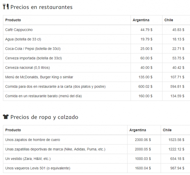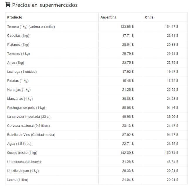 De este listado se destaca que pese al carácter de agrícola ganadero, hoy la leche y el pan salen más barato es Chile que en Argentina. Almorzar o cenar en un restaurant, que tiene que ver con la industria alimenticia, también hay mejores precios en Chile que en Argentina. Los servicios como electricidad, agua y gas en Chile se pagan más que en Argentina, no así con Internet, en el que este servicio es en promedio más económico en el vecino país.