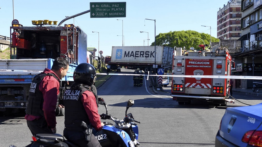 El incidente se registró poco antes de las 6.30 en la subida a la avenida General Paz de la calle Ramón Falcón y Rivadavia, cuando el conductor perdió el control del camión porque los frenos no funcionaron y el acoplado quedó colgado en el acceso, lo que generó que un colectivo de la línea 168 chocara con el eje trasero del camión, de acuerdo con información del área de Emergencias de la Ciudad de Buenos Aires.
