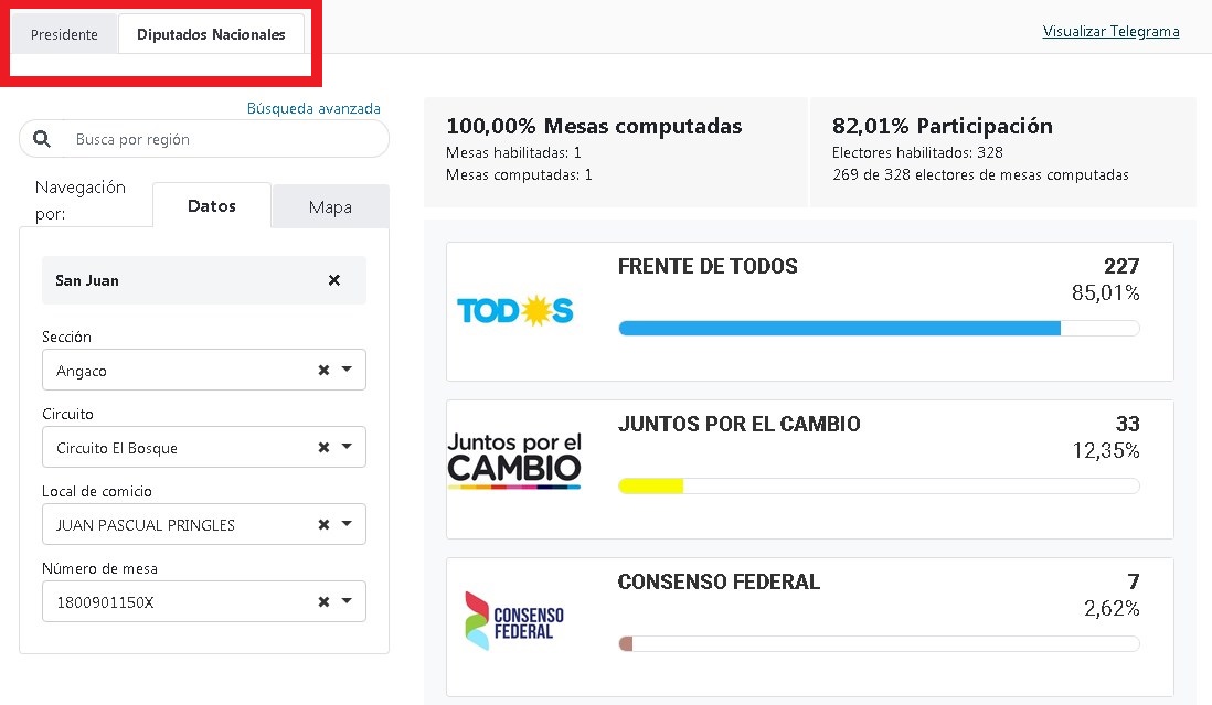 6- Si querés ver cómo fue la votación a Diputado, sólo debés cambiar la pestaña que se encuentra en el borde superior izquierdo.