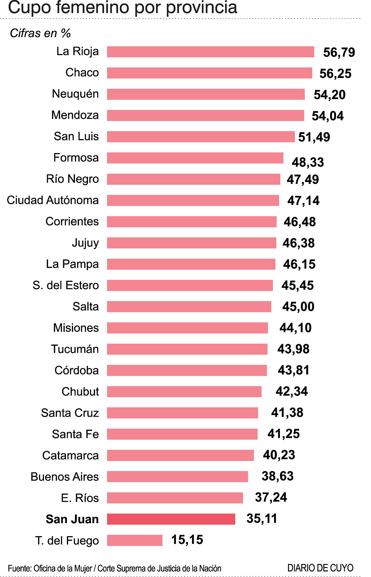 El mapa de género de San Juan refleja una amplia disparidad con otros distritos del país. La provincia está por arriba sólo de Tierra del Fuego, que cuenta con un 15,15 por ciento de mujeres que son magistradas, mientras que del resto, la mayoría cuenta con cifras superiores al 40 por ciento. En el primer lugar de la tabla está La Rioja con el 56,79 por ciento, 21 puntos más que San Juan (ver infografía).