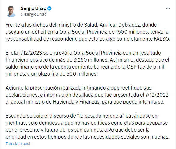 En lo que podría denominarse como ‘el primer cruce’ entre la actual gestión gubernamental sanjuanina con la que estuvo hasta el pasado 10 de diciembre, el ex gobernador Sergio Uñac tomó el guante y le respondió al actual ministro de Salud, Amilcar Dobladez, quien afirmó que encontró un "millonario déficit" en la Obra Social Provincia (OSP).