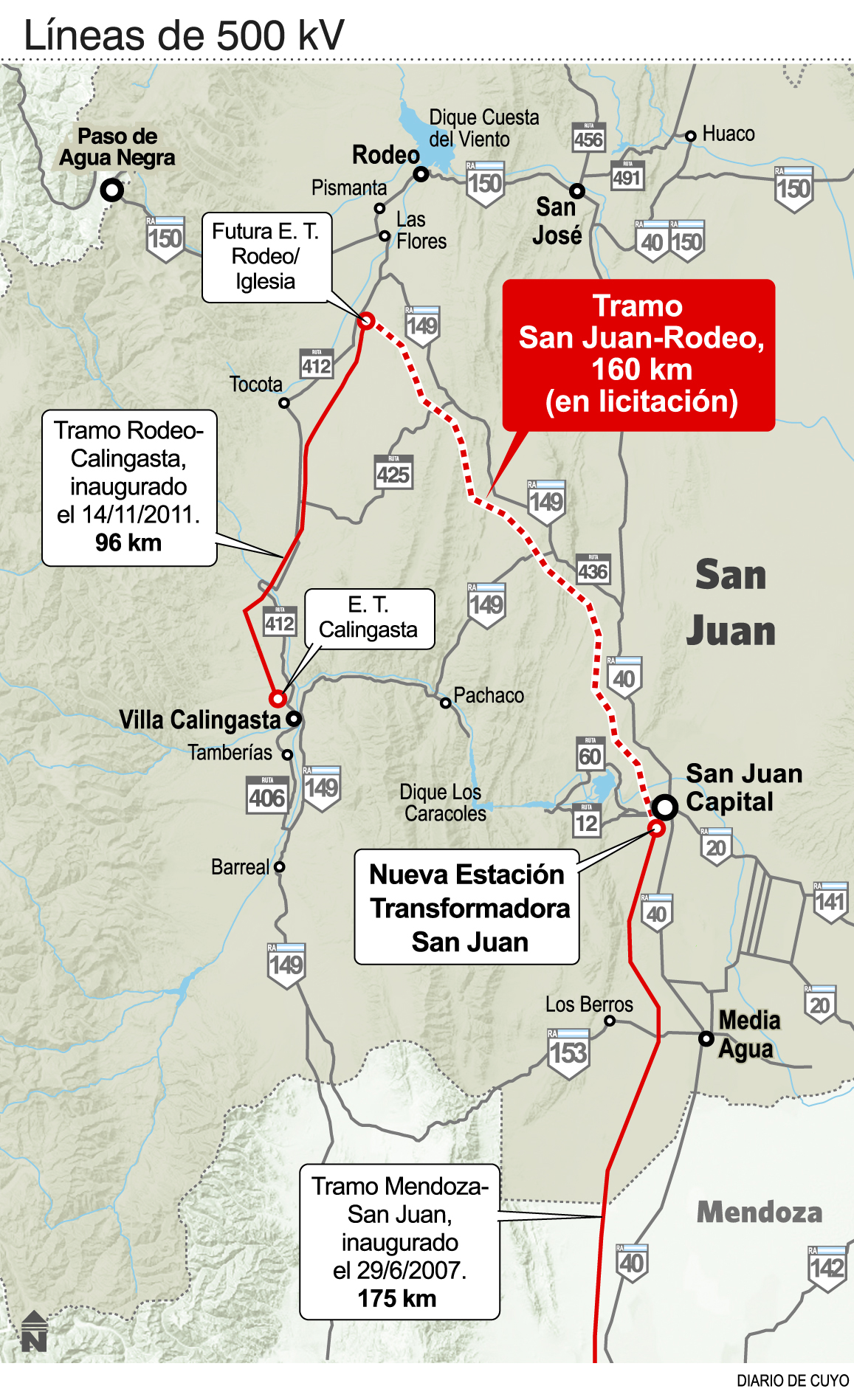 San Juan espera luz verde de la Nación para construir la línea de 500 kV Rodeo-La Rioja, y según lo anticipado ayer, la licitación puede ser pronto. Según dijo Osvaldo Rolando, subsecretario de Energía de la Nación, la obra ‘esta en carpeta del gobierno nacional’’ y anticipó que ‘en dos meses’ se lanzará licitación de obras de transporte para atender la futura demanda y las energías renovables. En San Juan ya tienen el proyecto listo y los pliegos de licitación aprobados por Transener para poder aprovechar inmediatamente cuando la Nación, que debe aportar el 50% del financiamiento, decida dar vía libre a la obra. ‘’Eso permitirá que San Juan y La Rioja tengan abastecimiento más seguro. Más adelante vendrá la conexión Calingasta-Gran Mendoza, para atender el futuro proyecto mendocino Cordón del Plata’’, explicó el titular del EPRE, Rivera Prudencio. Agregó que en la zona de Calingasta hay proyectos de energías no convencionales por 80 MW y además en la zona de Tocota se preparan proyectos por más de 600 MW para presentarse en la Segunda Ronda del Plan Renovar, por lo que hay que ir preparando cómo sacar la electricidad de esa zona.