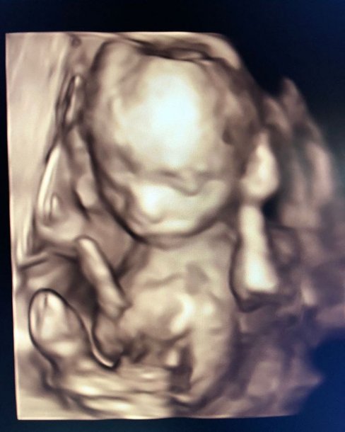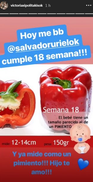 “Y con ustedes, les presento al milagro de cuatro meses: @salvadorurielok Hoy cumple 18 semanas, ya mide como un pimiento y me regalo estas imágenes; es la primera vez que le conozco la carita y no quería dejar de compartirlo con ustedes” #SeMeExplotaElCorazónDeFelicidad ¿Lo ven parecido a mí?”, escribió Vicky en su cuenta de Instagram.