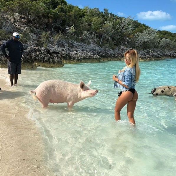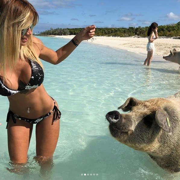 No hace falta describir mucho más. Básicamente se trata de Ciardone rodeada de chanchos en una playa paradisíaca de las Bahamas, en pleno Caribe.