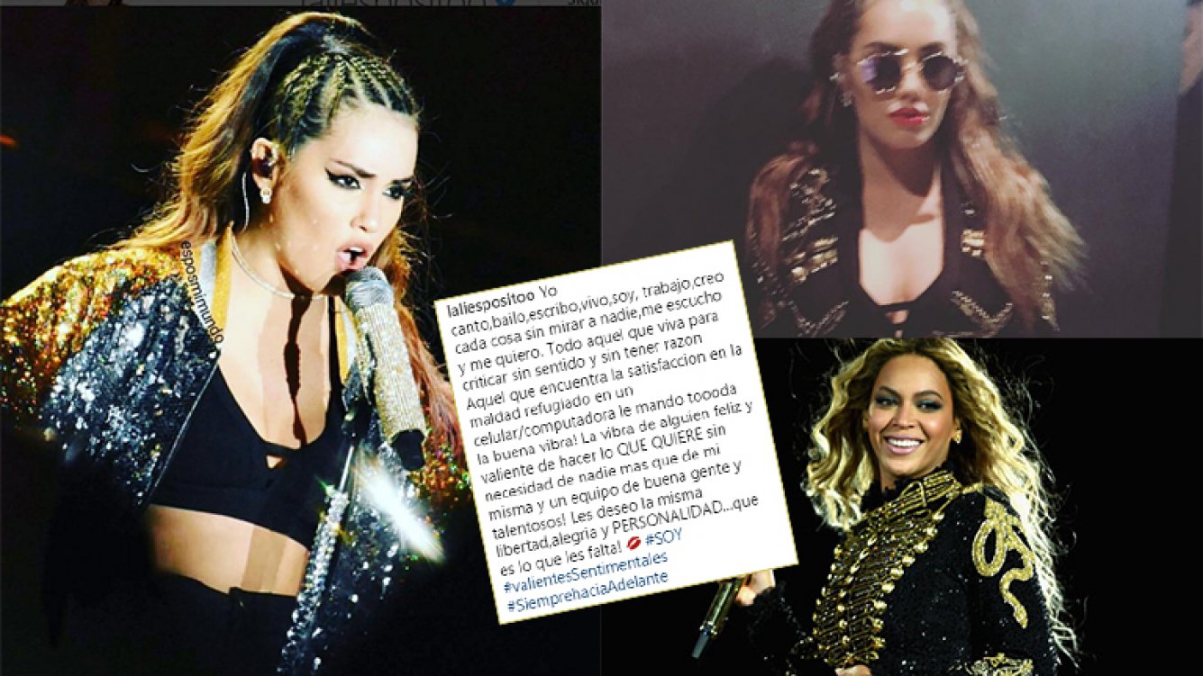 Lali compartió una fotografía con un llamativo look en negro y dorado que lució en su gira musical y varios usuarios la acusaron de copiarse de Beyoncé: “Me gustaría que @laliespositoo tenga su propio look, le copia mucho a Jennifer Lopez y Beyoncé… Digo me parece que necesita look propio” y “Beyoncé, ¿sos vos?”, fueron algunas de las críticas que se pueden leer.
