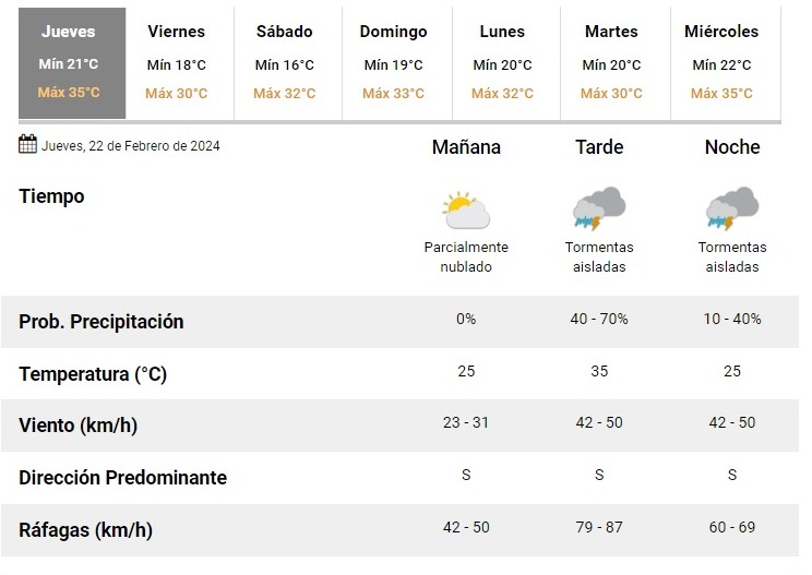 Por la mañana el cielo parcialmente nublado y la temperatura máxima llegará a los 35 grados. Además, por por la tarde y noche se esperan tormentas aisladas.