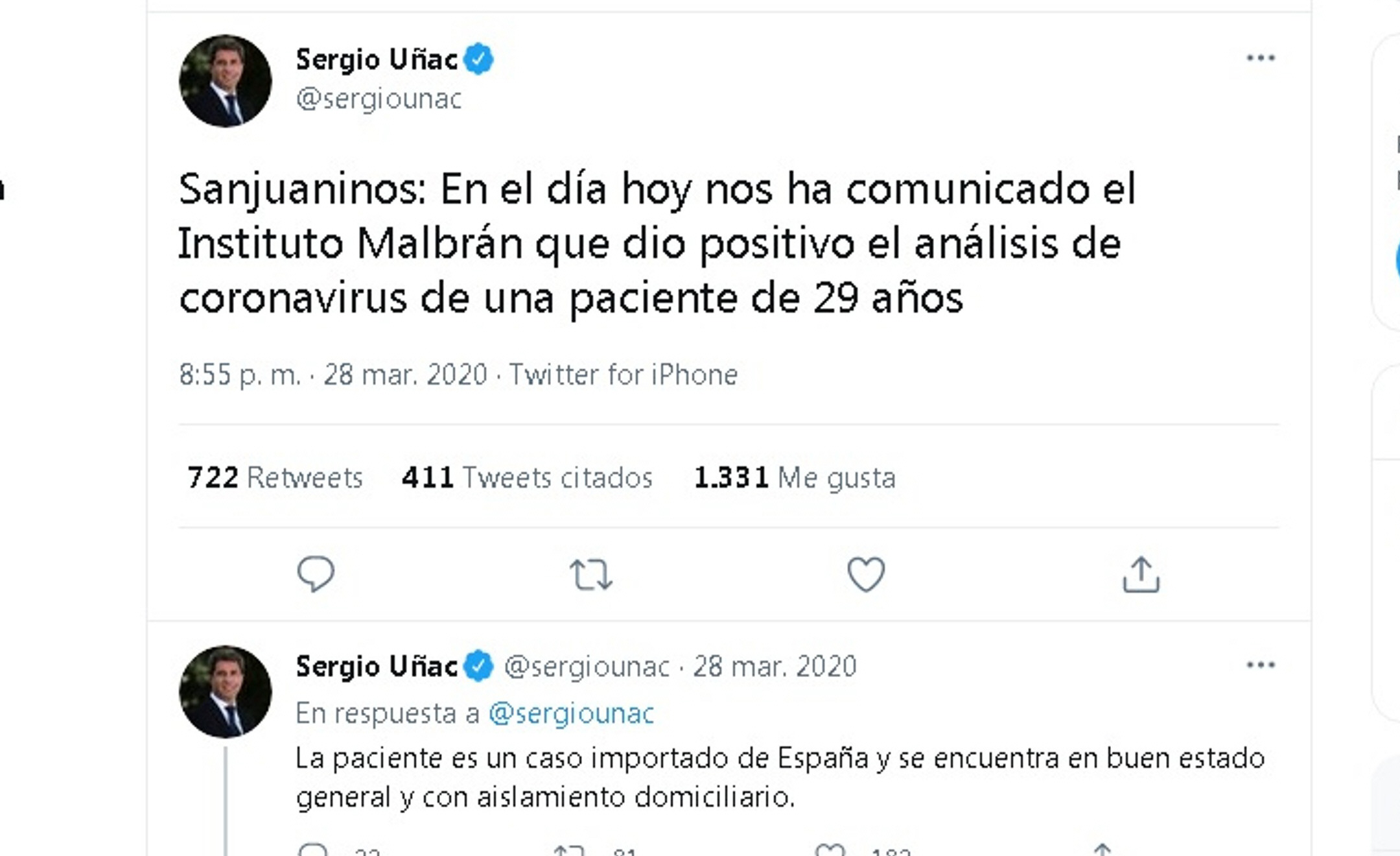 "Sanjuaninos: en el día de hoy nos ha comunicado el Instituto Malbrán que dio positivo el análisis de coronavirus de una paciente de 29 años", tuiteó Uñac, una de las novedades que por entonces más impacto tuvo en la opinión pública. La cronología de aquel hecho había comenzado un rato antes del tuit y Jofré lo relató con detalles, por primera vez. "Me acuerdo de todo. En ese momento enviábamos los hisopados al Instituto Malbrán y todos los días, entre las 6 y 7 de la tarde, cargábamos las novedades en la plataforma, casi al mismo tiempo que Nación daba a conocer el parte diario. Me sonó el celular con un mensaje, era uno de los chicos que cargaba el sistema. Hay un positivo me decía", repasó Jofré.