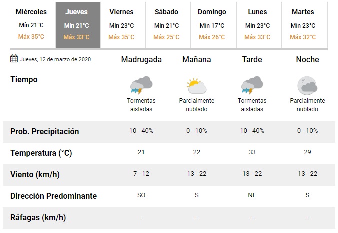Del mismo modo, prevén que el jueves la máxima ascienda hasta los 33°C mientras que la mínima caerá hasta los 21°C. La jornada estará marcada por tormentas aisladas y vientos de direcciones variables.