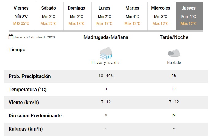 El pronóstico del Servicio Meteorológico Nacional sorprendió a todos. Es que según se estima, el próximo jueves podría nevar en el Gran San Juan. En un invierno bastante más cálido de lo habitual, se espera que la próxima semana arranque con una máxima de 17 grados.