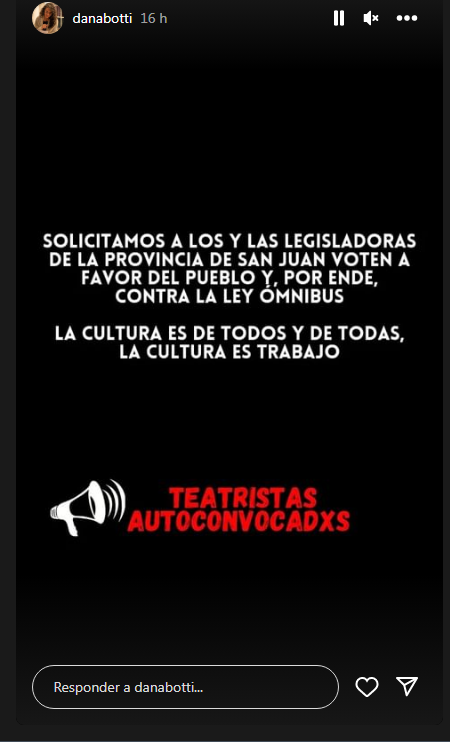 "Estamos preocupados por todos los artículos que plantea la ley ómnibus pero principalmente porque perjudica la Ley del Teatro, de la que surge el Instituto Nacional del Teatro (INT). Que permite que se desarrolle la actividad teatral independiente en todo el país, una ley realmente federal", explicó.