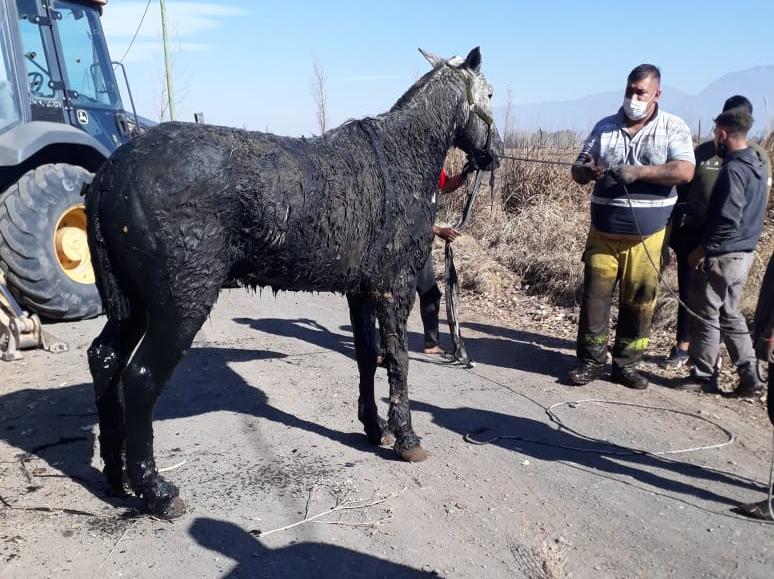 Personal de Bomberos de Rawson y la brigada forestal de Protección Civil trabajaron para poder rescatar a un caballo que quedó atrapado en el lodo de un canal profundo.